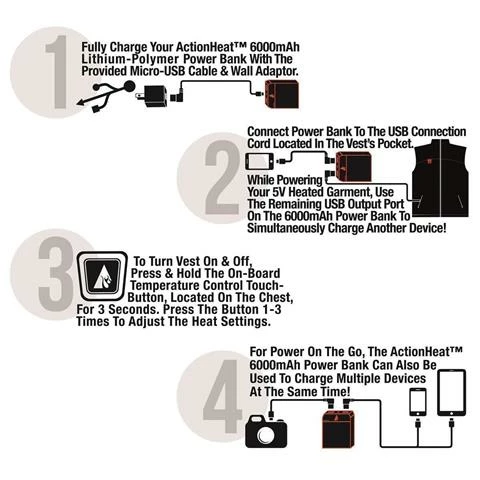 The ActionHeatâ„¢ battery heated vests are revolutionary in the world of heated clothing. Using the patented 5V signal technology, it allows for any 5V battery to be used with the ActionHeat Jackets and Vests. This allows for unlimited battery options and gives you more options! The ActionHeat Jacket comes with a super powerful ActionHeatâ„¢ 5V Power Bank 6000mAh. This powerbank powers your jacket and can also charge your phone, tablet, or any USB charged device. Note: Heating times will deminish if used to charge other devices.
